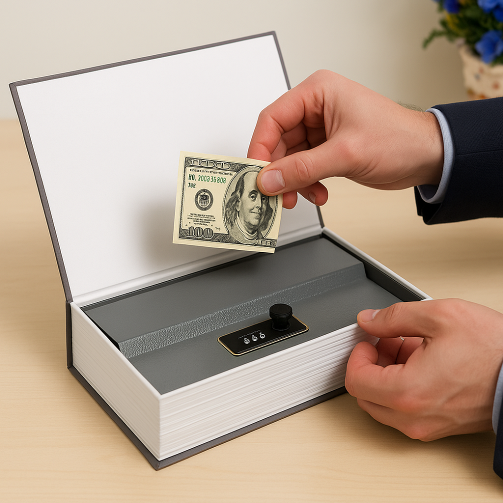 Your valuables deserve better than a sock drawer. Enter SafePages — the premium password-protected safe hidden inside a convincingly realistic book cover. Behind the stylish exterior lies a solid metal lockbox, compact enough to fit anywhere, secure enough to trust with your most personal belongings. Whether you're storing emergency cash, family keepsakes, or sensitive items, SafePages offers stealth security without the bulky hardware.